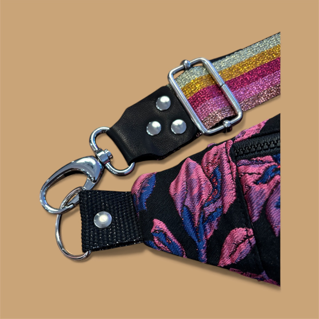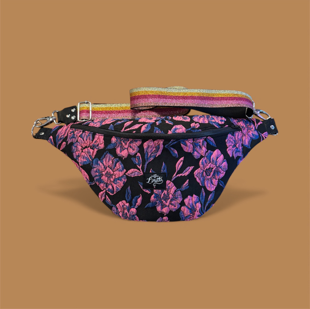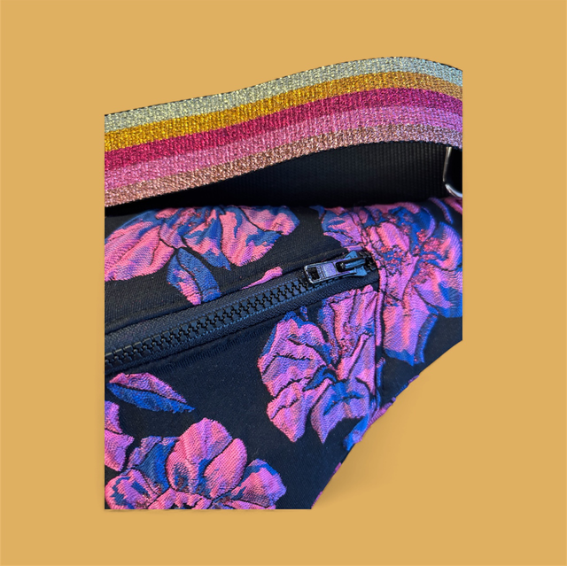 Une banane chic et atypique, conçue dans un jacquard premium au fond noir avec un effet 3D surprenant. Ses fleurs bleu et rose, réhaussées d’un fil fuchsia irisé, apportent volume et luminosité.