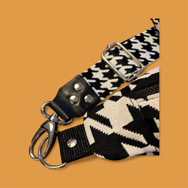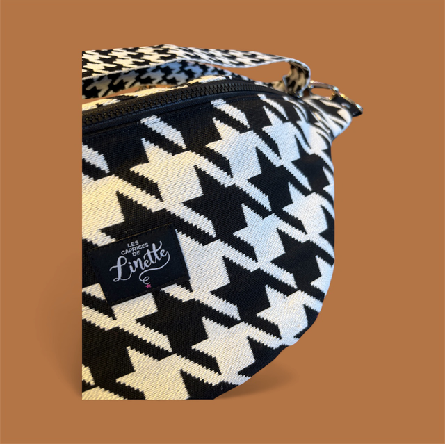 Une banane élégante en jacquard pied de poule noir et blanc, un motif intemporel revisité avec une touche moderne et audacieuse. Le tissu jacquard apporte relief et qualité premium.