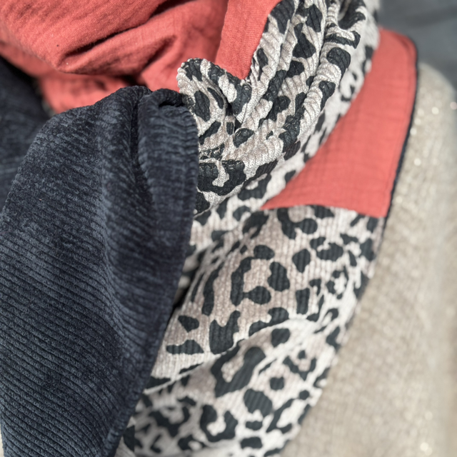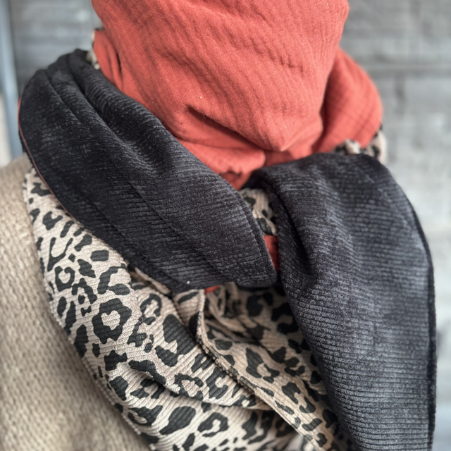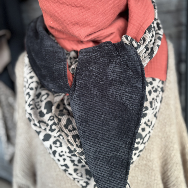 Une écharpe triangle chaleureuse et intense, composée d’une gaze de coton coloris brique, associée à la bande signature en velours léopard taupe. Le velours uni noir apporte du contraste et une touche élégante. Une pièce unique, chaude, tendance et pleine de caractère.