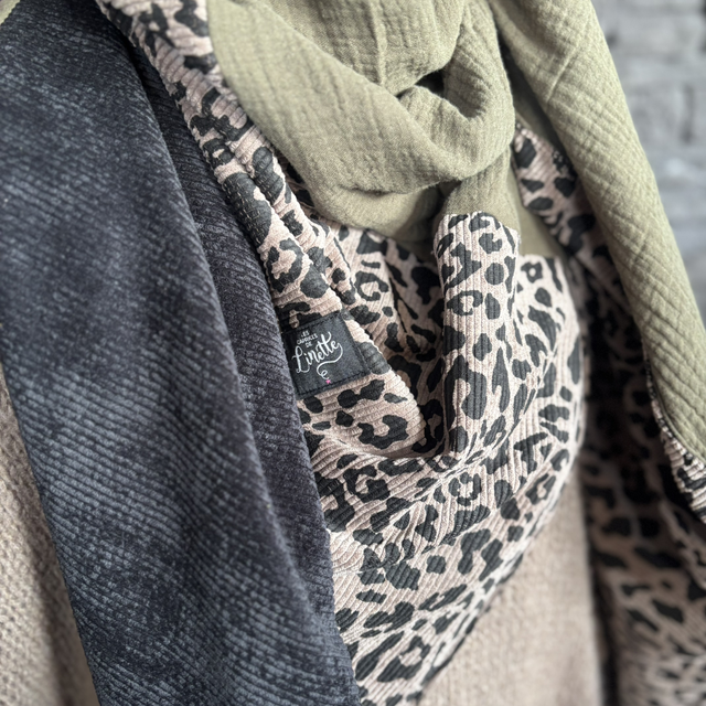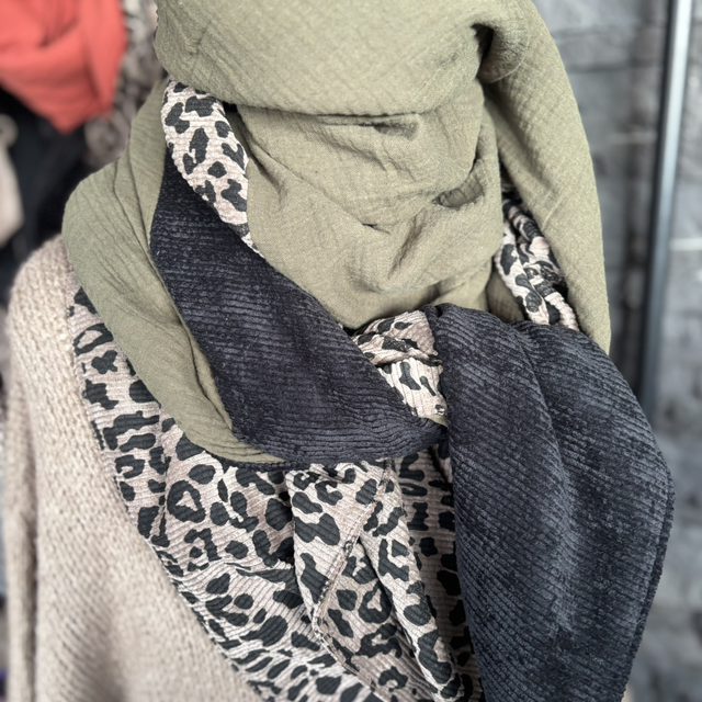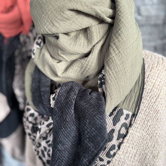 Une écharpe triangle moderne et intemporelle, réalisée en gaze de coton vert kaki. La bande signature en velours léopard taupe apporte du caractère, tandis que le velours uni noir ajoute une touche chic et contrastée. Une pièce unique, chaude, facile à porter et résolument tendance.