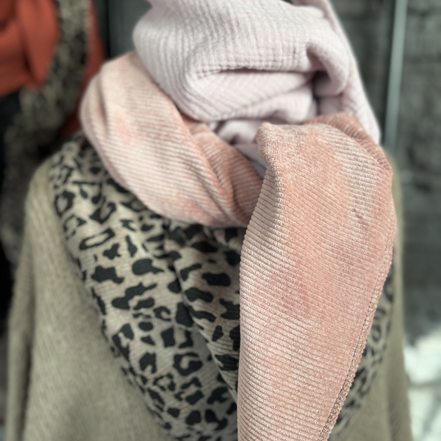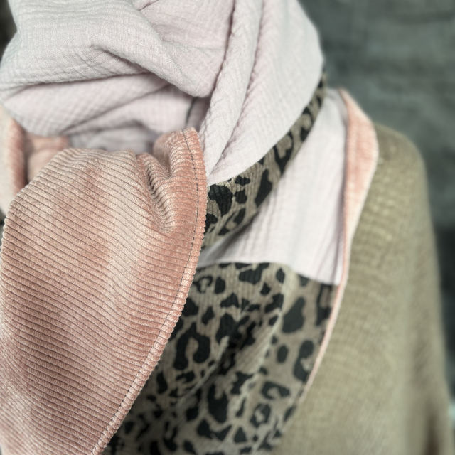 Une écharpe triangle douce et élégante, composée d’une gaze de coton rose pâle associée à la bande signature en velours léopard taupe. Le velours uni rose poudré apporte une finition délicate et féminine. Une pièce unique, chaude, réconfortante et pleine de charme.