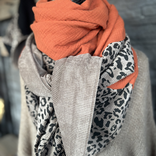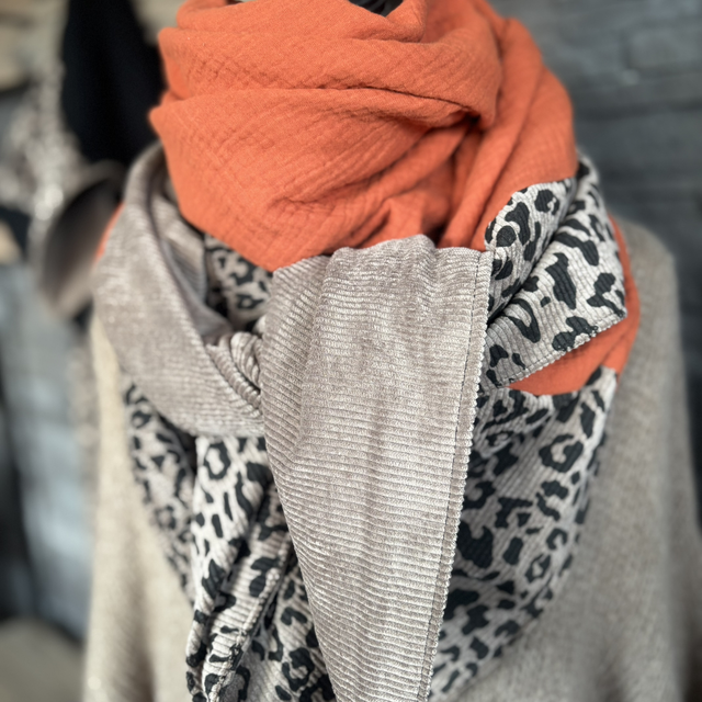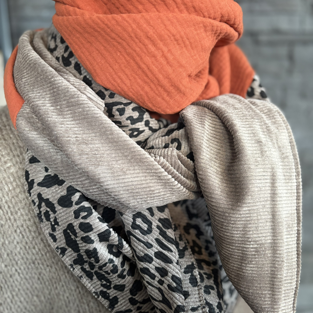 Une écharpe triangle chaleureuse et affirmée, mêlant la douceur de la gaze de coton terracotta à la bande signature en velours léopard taupe. Le velours uni taupe apporte une finition élégante et facile à assortir. Une pièce unique, chaude, moderne et pleine de caractère.