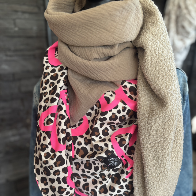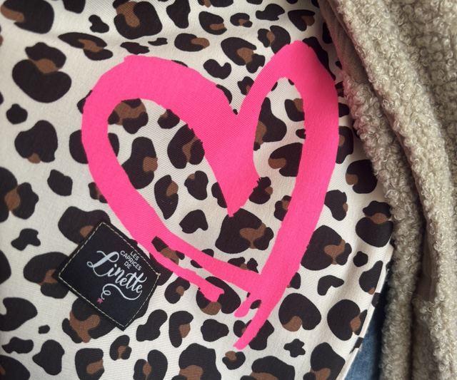 - Matières : moumoute Teddy + gaze de coton et jersey léopard cœur fluo