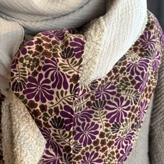 Réversible, cette écharpe se porte côté gaze pour un look doux et lumineux, ou côté velours et bouclette pour un style plus texturé et chaleureux.