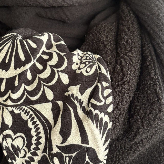- Matières : moumoute Teddy ou sherpa + gaze de coton et viscose