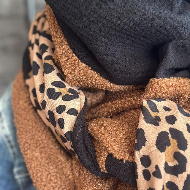 - Matières : moumoute Teddy ou sherpa + gaze de coton et viscose