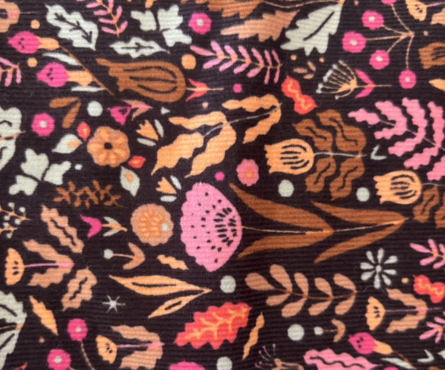 - une bande de velours milleré fleuri aux teintes cuivrées et rosées,