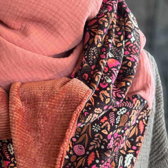 Réversible, cette écharpe se porte aussi bien côté velours que côté gaze, selon ton envie du jour.