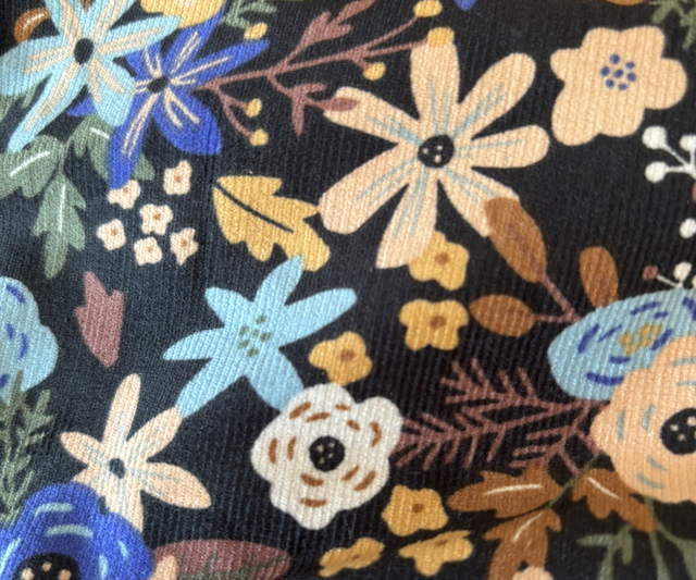 - une bande en velours milleré fleuri aux nuances bleu, doré et brun,