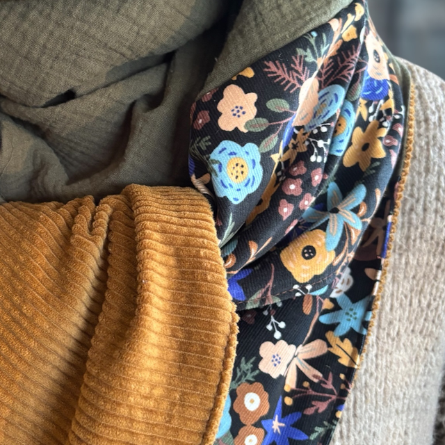 - une bande en velours côtelé camel, pour une touche chaleureuse et élégante.