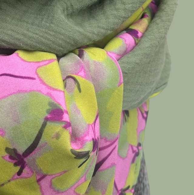 Grand triangle (≈140 cm) en gaze de coton , une matière douce et thermorégulatrice : elle garde la chaleur en hiver et reste respirante en été assortie à une viscose de qualité .
