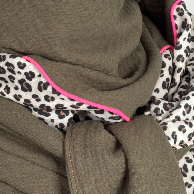 Un foulard triangle en gaze de coton mêlant un uni kaki profond à un léopard beige et noir, sublimé par un liseré rose fluo.