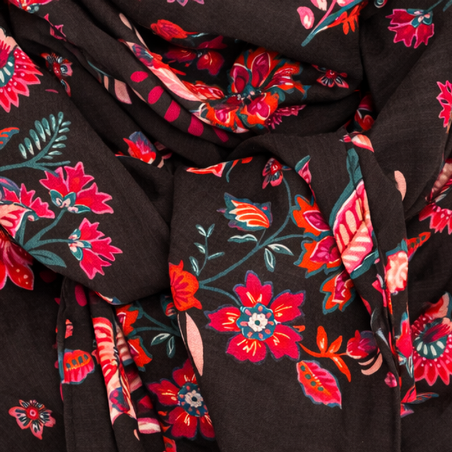 Fond noir intense sublimé par de délicates fleurs indiennes aux couleurs vibrantes (rouge, corail, rose et bleu canard).