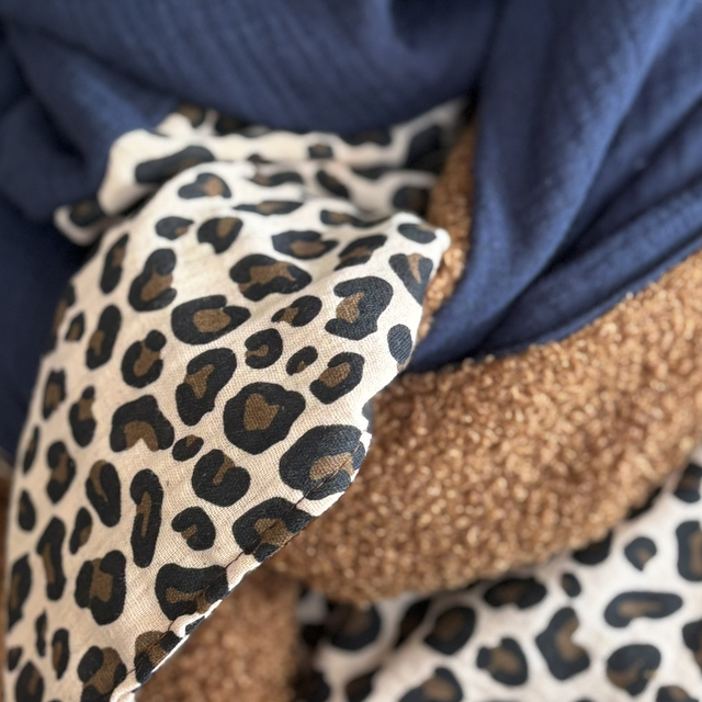 - une double gaze de coton bio imprimée léopard, pour la touche mode et féminine,