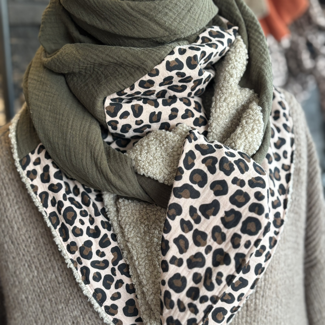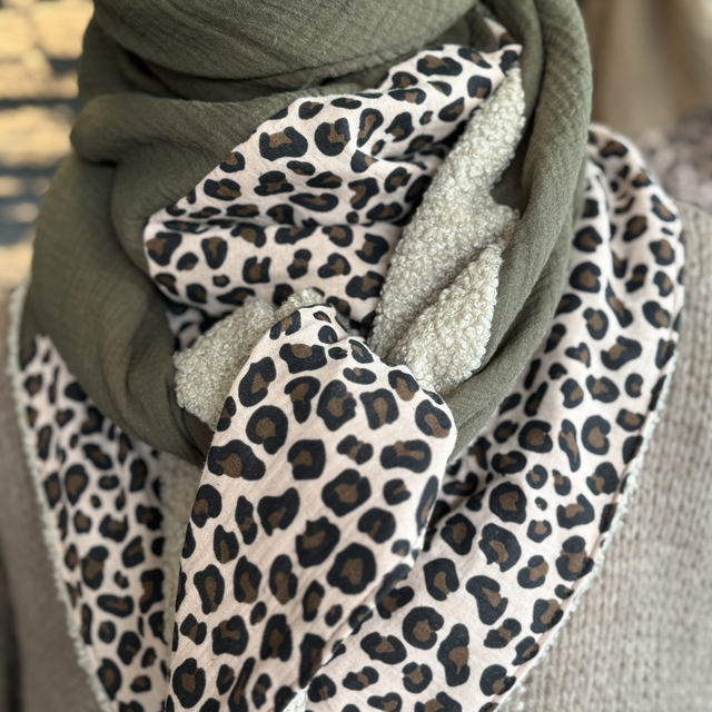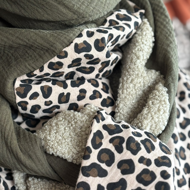 - une double gaze de coton bio imprimée léopard, pour la touche sauvage et féminine,