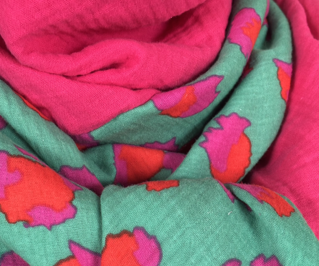 Un foulard lumineux qui associe une double gaze de coton fuchsia intense à un motif léopard pep’s vert, fuchsia et orange.
