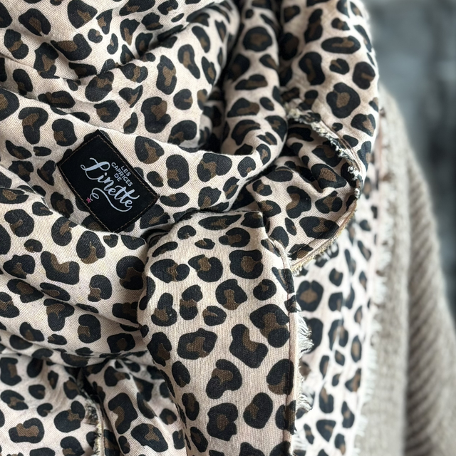 Ce foulard triangle Léopard Sauvage est entièrement réalisé en double gaze de coton bio, un tissu léger, respirant et incroyablement agréable à porter.